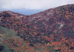 ハイマツやツツジなどの低木帯の熊見曽根両側に広がる樹林帯の紅葉は、那須岳のビューポイントのひとつである、